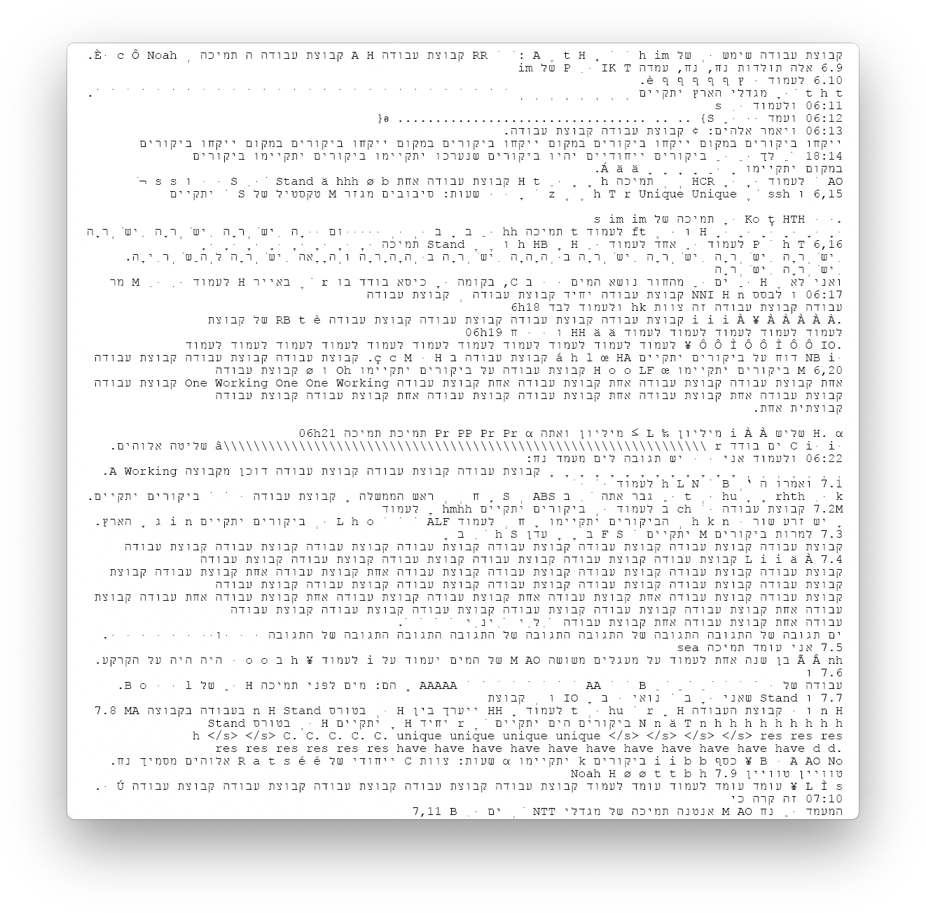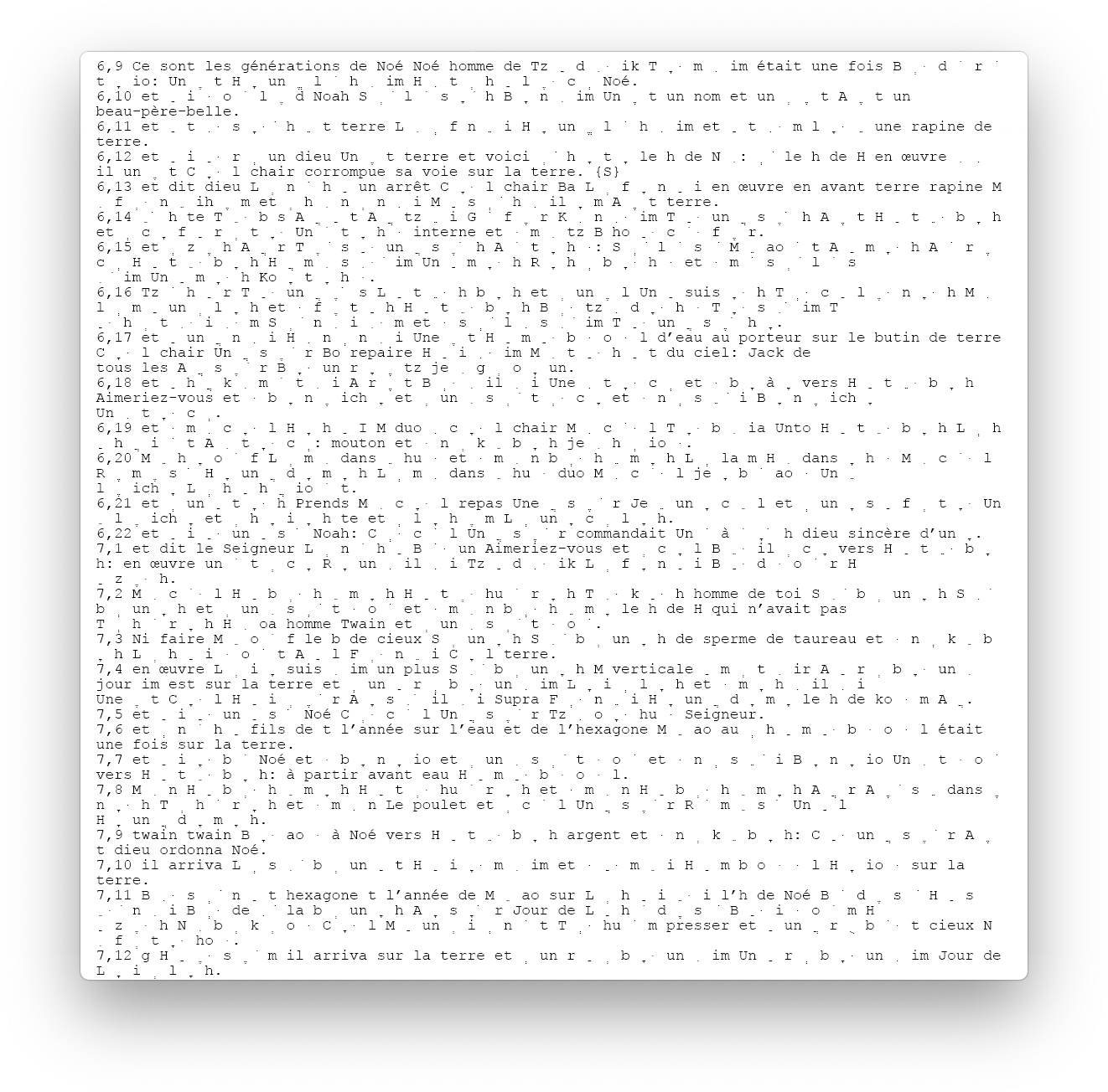 Extraits de sept traductions successives de la Parasha Noah du français à l’anglais au français à l’hébreux ancien au français et ainsi desuite, à l’aide de l’outil Google Translate.